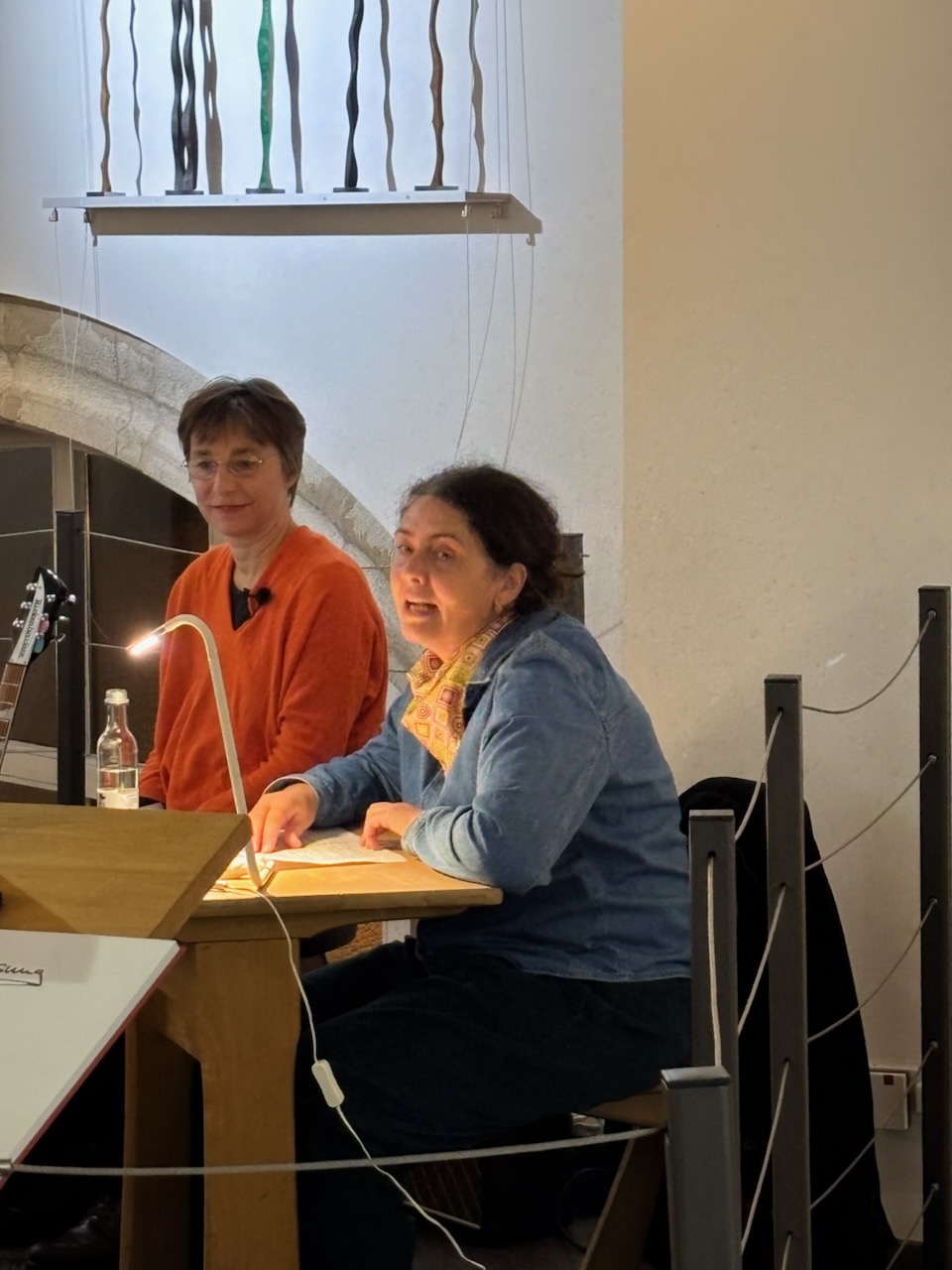 Autorin Angela Kreuz (links) und die eine tschechische Passage sprechende Barbora Pokorny. Untermalt wurde die Lesung mit Stücken an Gitarre und Cello von der Autorin und Dieter Lohr (Fotos: Wolfgang Otto).