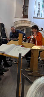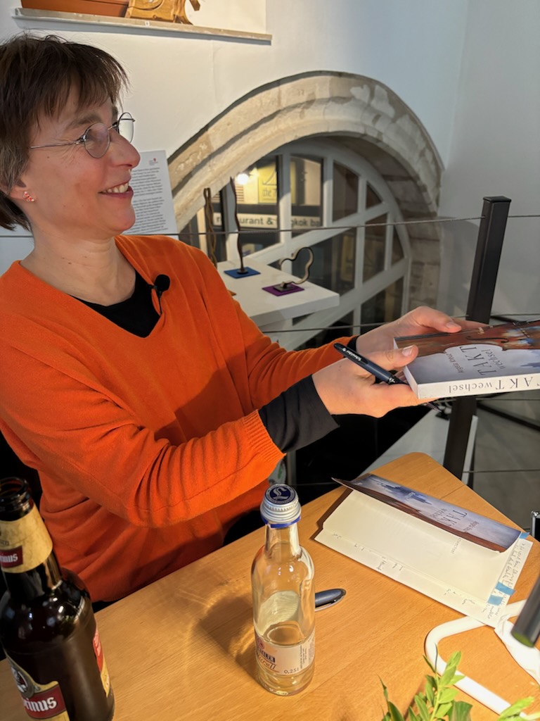 Mit der Rezitierung eindrucksvoller Passagen sowohl in der Originalsprache als auch in tschechischer Übersetzung durch Barbora Pokorny, die in Regensburg eine Sozialstation der Caritas leitet, wurde den Anwesenden eine schöner Eindruck des Werks von Angela Kreuz vermittelt, in dem die Liebesgeschichte der aus Bayern stammenden Sophie und ihres tschechischen Kollegen Milan im Mittelpunkt steht. Beide sind Cello-Spieler und so passte es wunderbar, als die Autorin zum Instrument griff, um mit ihrem Partner Dieter Lohr, selbst Schriftsteller und Verleger, an der Gitarre die Lesung mit zum Teil Eigenkompositionen zu untermalen.